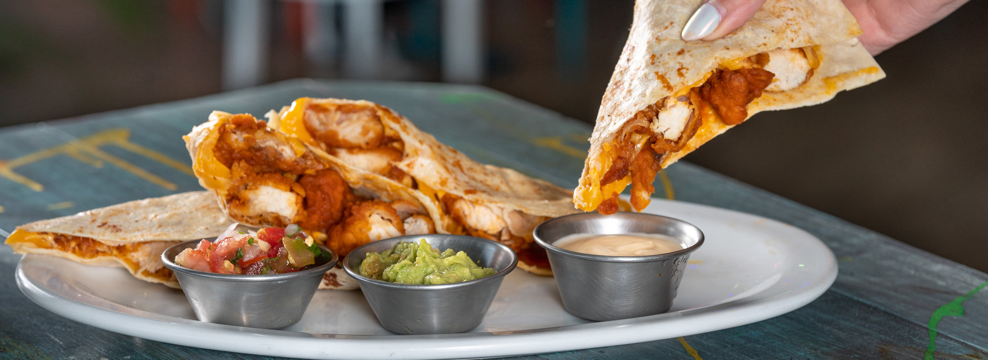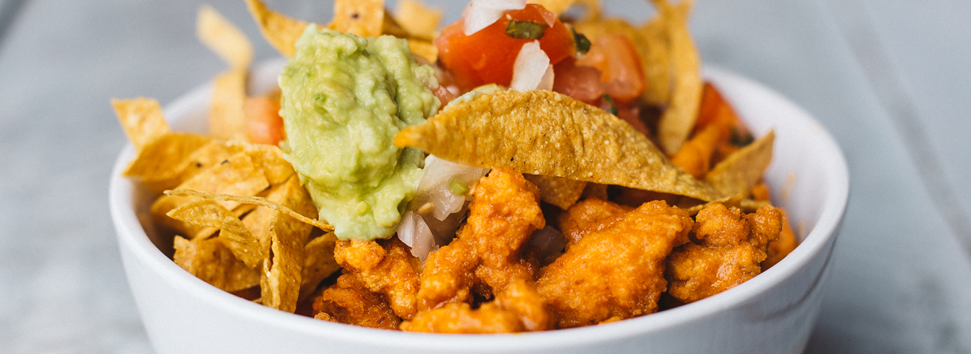 Con pollo búffalo, frijol molido, guacamole y pico de gallo.