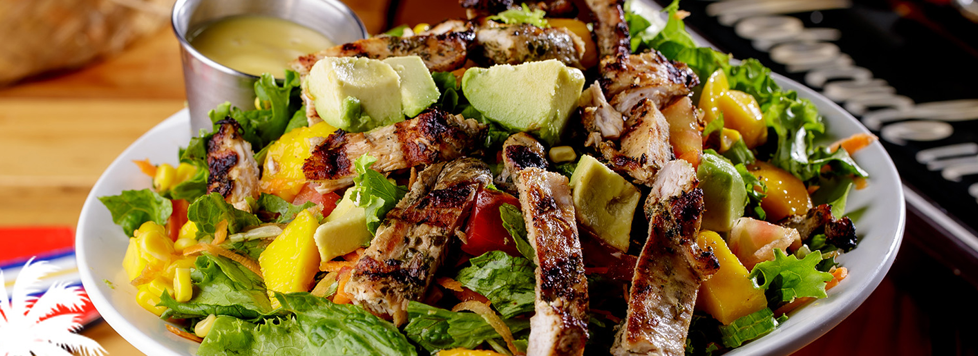 Pollo, mango, maíz, apio, tomate, aguacate, lechuga, culantro y aderezo honey mustard.