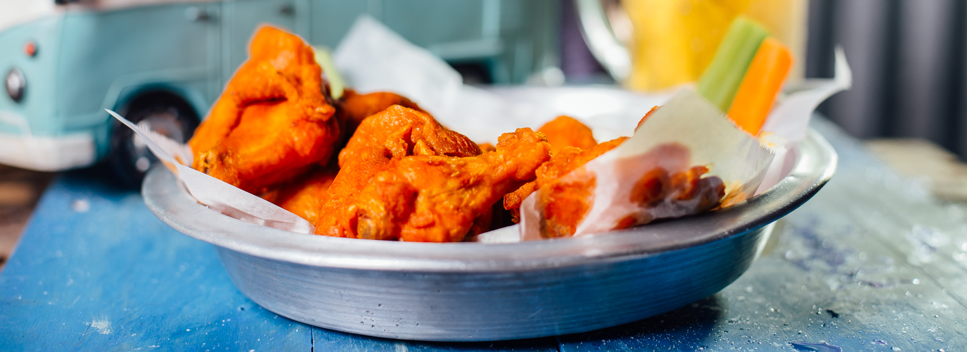 Buffalitos (picantes), alitas BBQ y strips de pollo honey mustard. Servido con papas y blue cheese.