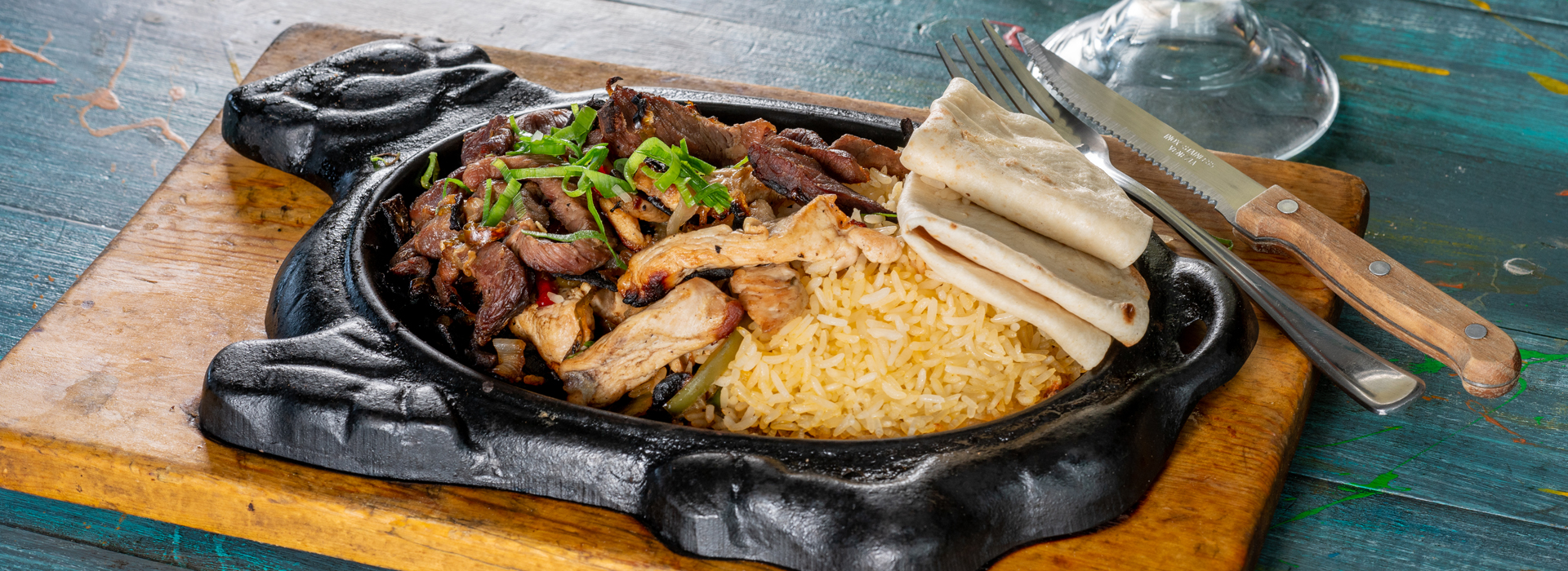 Todos con arroz, lechuga, pico de gallo, guacamole, natilla, queso rallado y tortillas de harina (Varios platos servidos juntos).