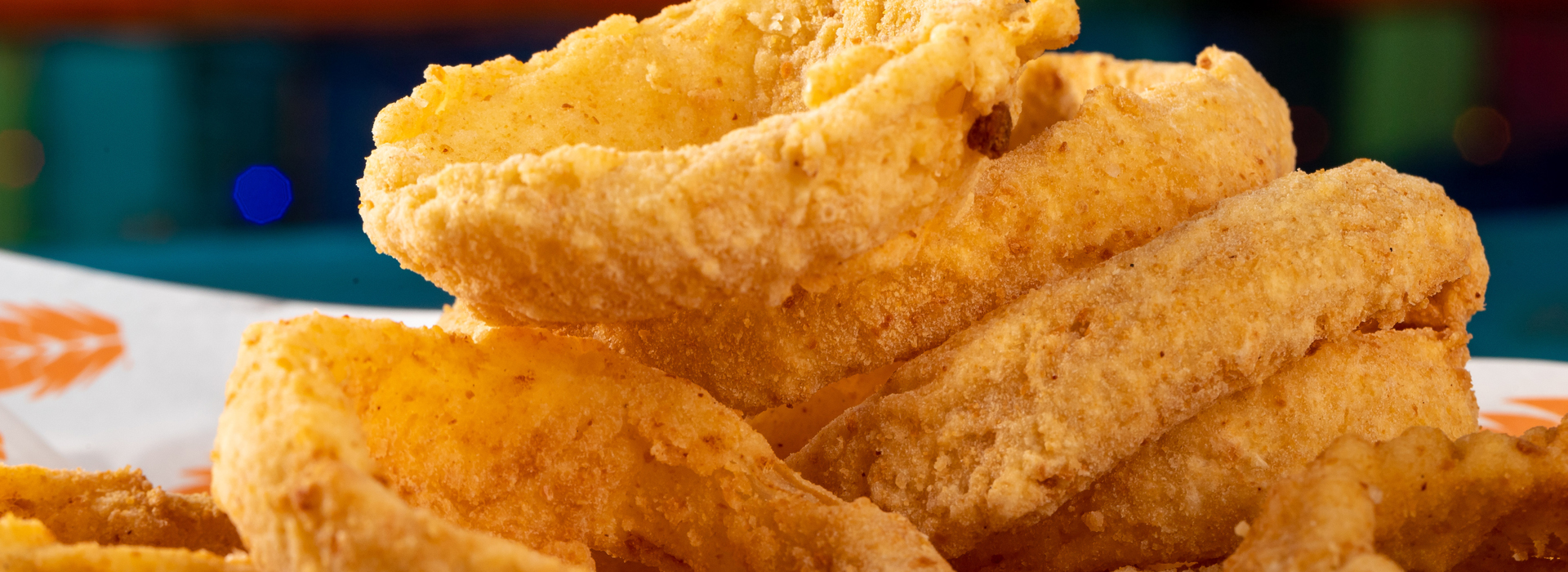 Para los amantes de los mariscos! Crujientes camarones, calamares, dedos de pescado y papas con deliciosas salsas.