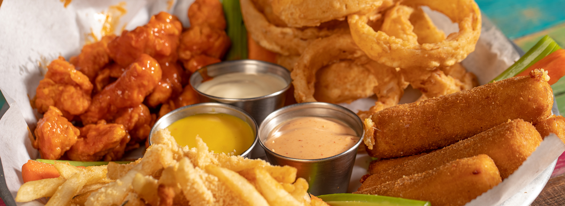 Buffalitos (picantes), alitas BBQ y strips de pollo honey mustard. Servido con papas y blue cheese.